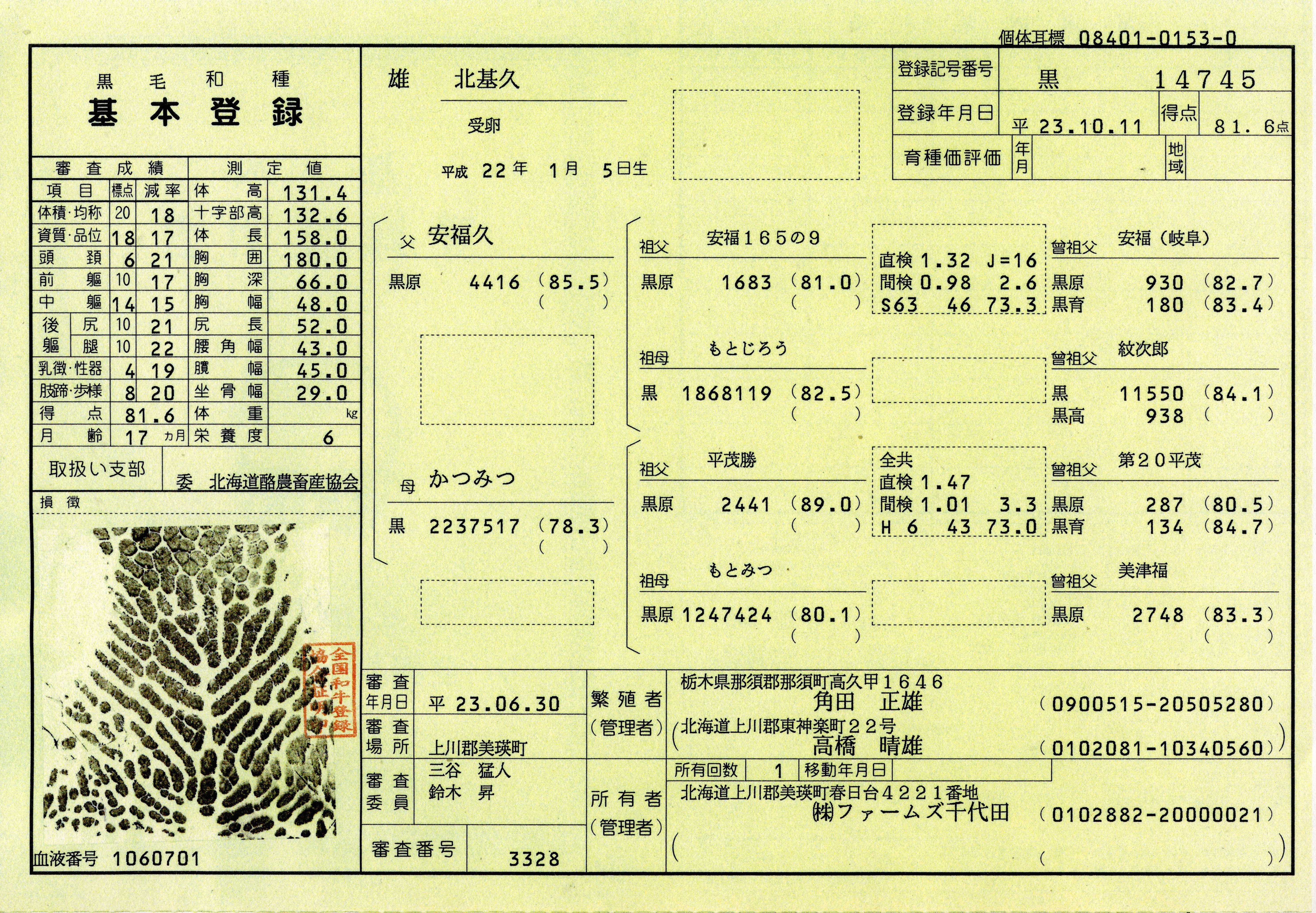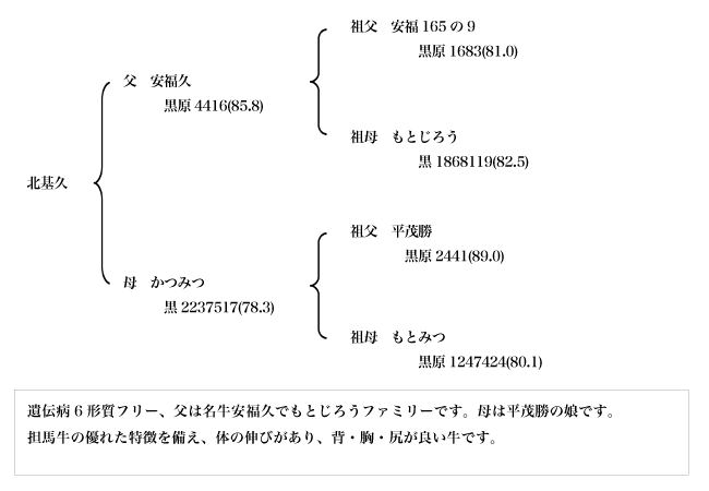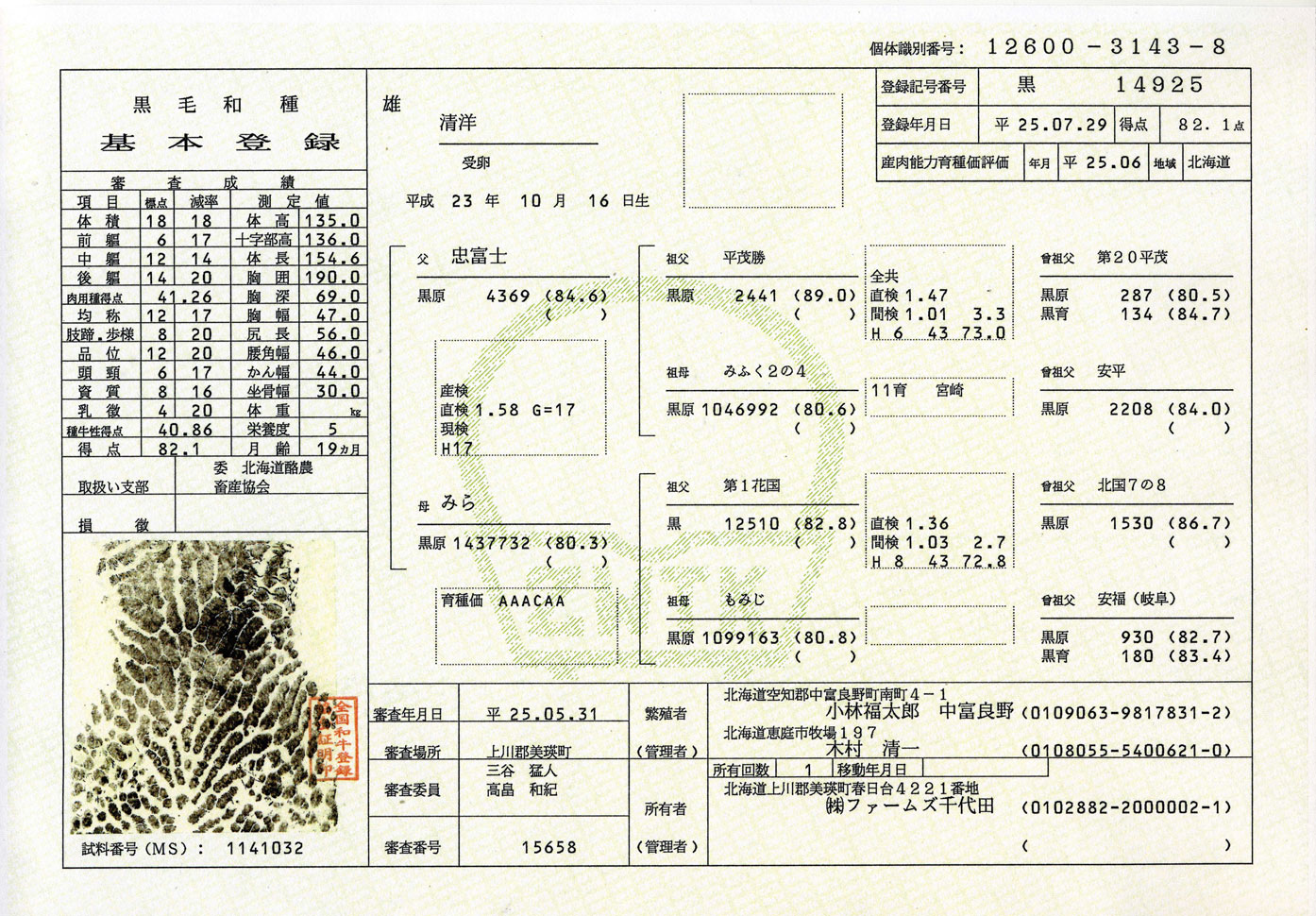 | 名号 | 種牛コード | 父 | 祖父 | 曾祖父 | 生年月日 | 個体識別番号 |
