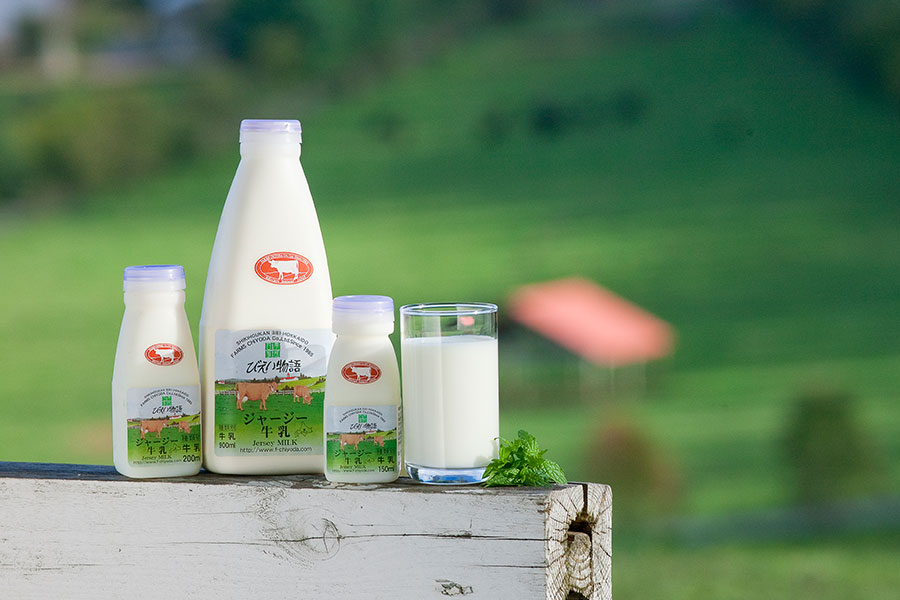 当社の牛乳は「ジャージー種」のミルクだけを使っています。乳量はホルスタイン種の1/3程度、 1日約10kgしか搾れないことから、とても貴重で高価な牛乳になっています。