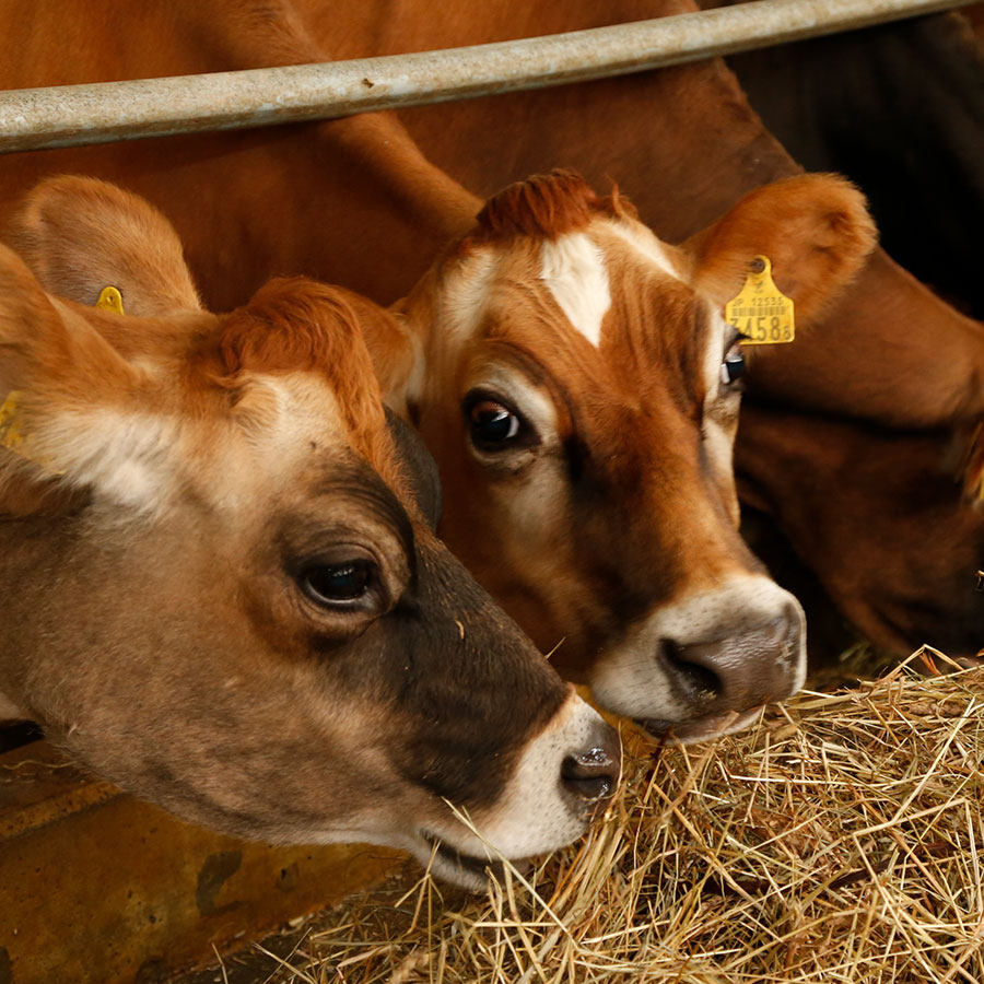 日本で飼育されている乳牛の99%がホルスタイン種(※一般社団法人中央酪農会議 調査)といわれる中、「ファームズ千代田」では、平成24年にジャージー牛を導入しました。1年間に生産する乳量の平均は、ホルスタインが約8,000kgに対し、ジャージー牛は約5,600kgと2/3程度。とても貴重で、高価なものです。また、乳脂肪分が5%、無脂固形分9%を超えるため、ホルスタインと比べ濃厚なのが特徴です。