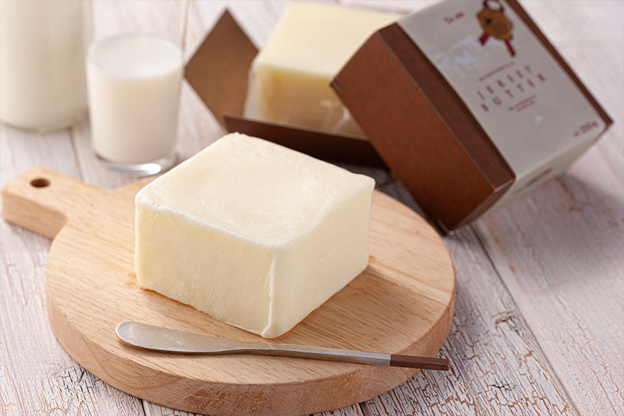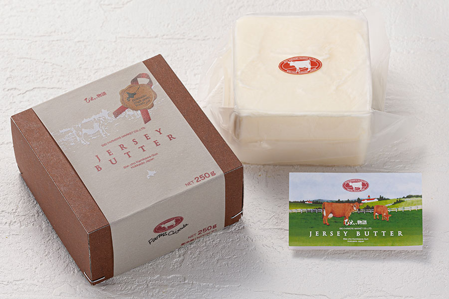 この度受賞いたしました当社のジャージーバターは、原材料にジャージー牛乳のみを 100%使用し、保存料や添加物などは一切不使用の無塩バターです。味わいは、滑らかな口どけの中にコクがあり、爽やかな旨みが特徴の当社自慢のバターです。